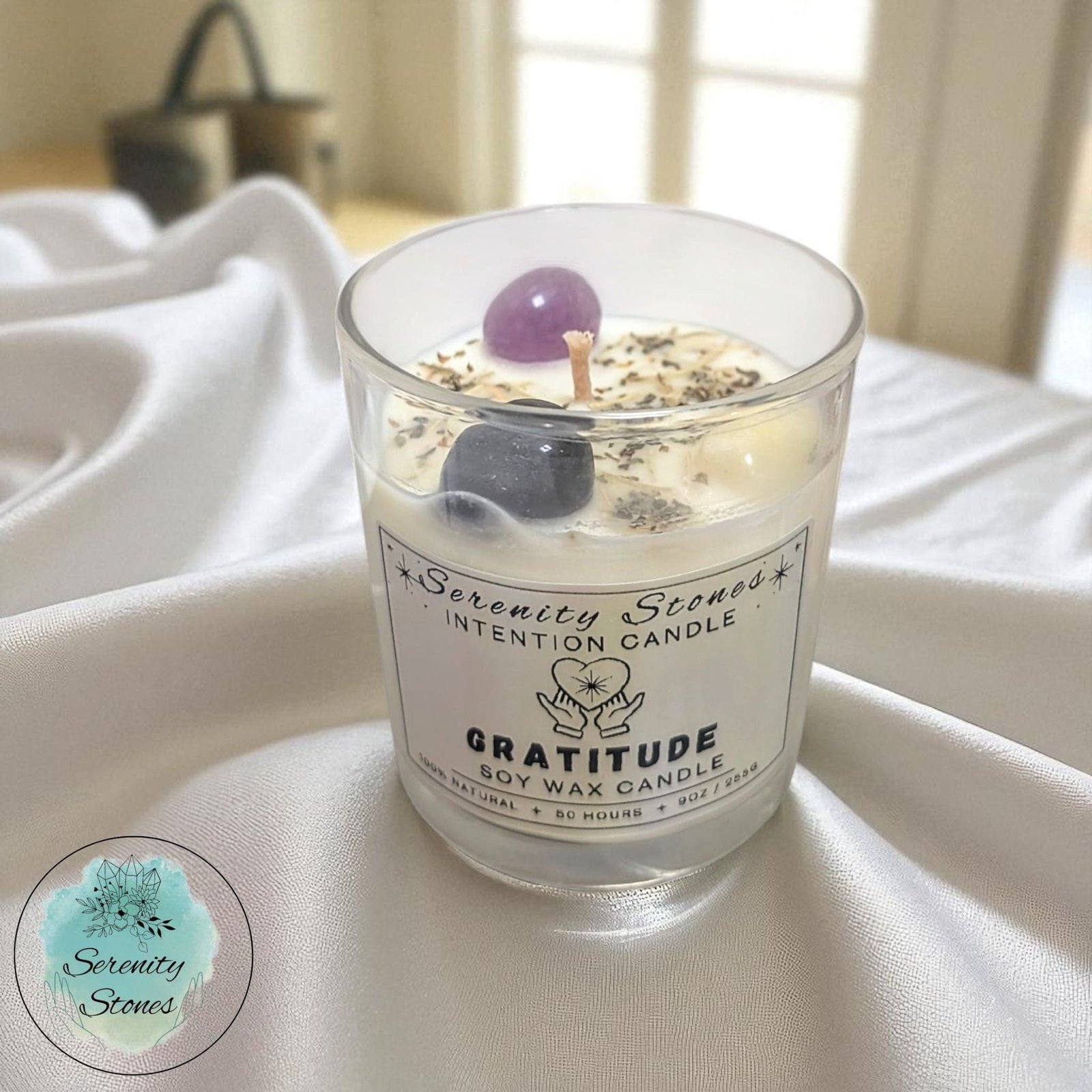 Each candle is made from natural soy wax and infused with aromatic fragrance oil. Each crystal is selected to amplify the benefits. Light with intention to acknowledge your blessings and invite more mindful, thankful energy into your space.