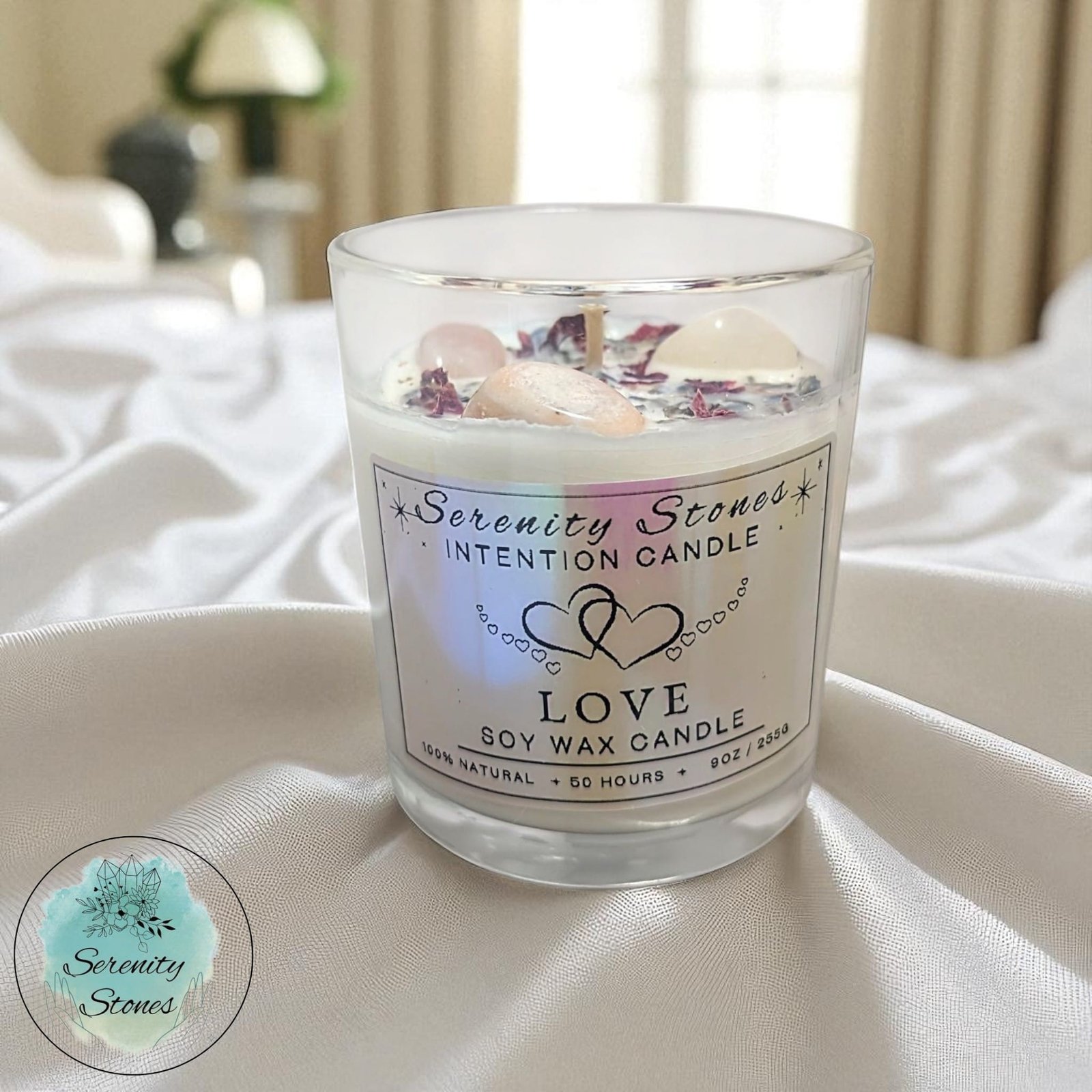 Open your heart and invite in deep, compassionate love with the Love Intention Crystal Candle. Hand-poured with natural soy wax and delicately scented with a romantic blend of rose and peach, this candle is designed to nurture self-love, emotional healing, and meaningful connection.